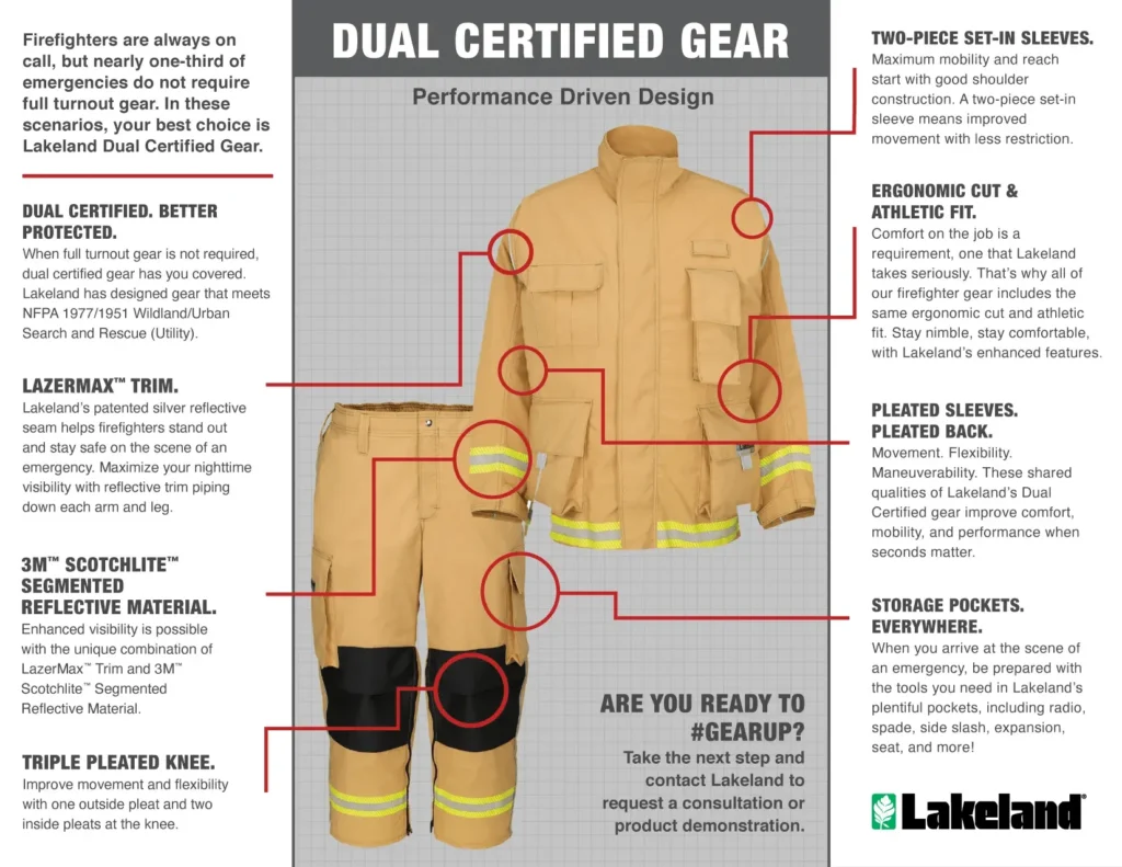 Pourquoi ? Jetez un coup d'œil à notre infographie PDF sur l'équipement de lutte contre l'incendie à double certification pour voir pourquoi l'équipement de lutte contre l'incendie à double certification de Lakeland pourrait être le bon choix pour votre service de lutte contre l'incendie.